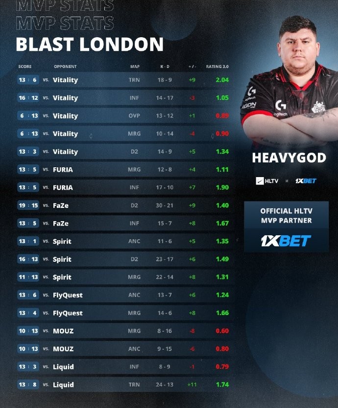 而G2在送走尼孩组合后终于东山再起,HeavyGod、MATYS赢下生涯首个大赛冠军,重神也凭借整轮系列赛的稳定发挥收获生涯首个HLTV-MVP奖牌!
