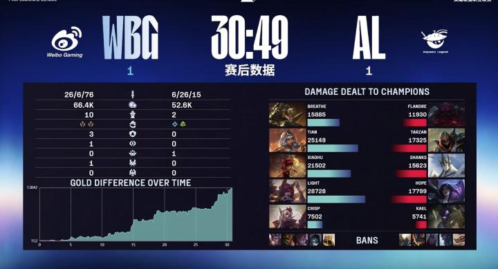 第30分钟,WBG大龙推进完成2换5,Tian奇亚娜砍下三杀,游戏结束,比分来到1-1。