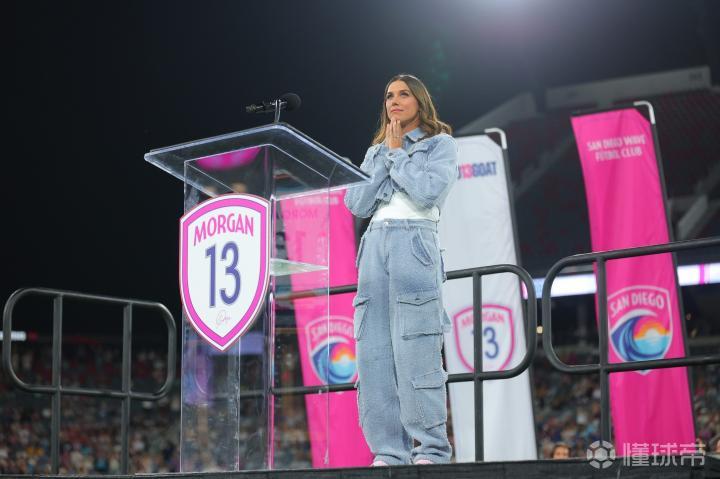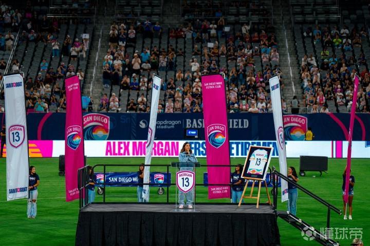 在本轮美国国家女子足球联赛(NWSL)圣地亚哥波浪女足对阵休斯顿达斯女足的比赛前,圣地亚哥波浪俱乐部为前美国女足传奇球星亚历克斯-摩根正式退役了她的13号球衣。