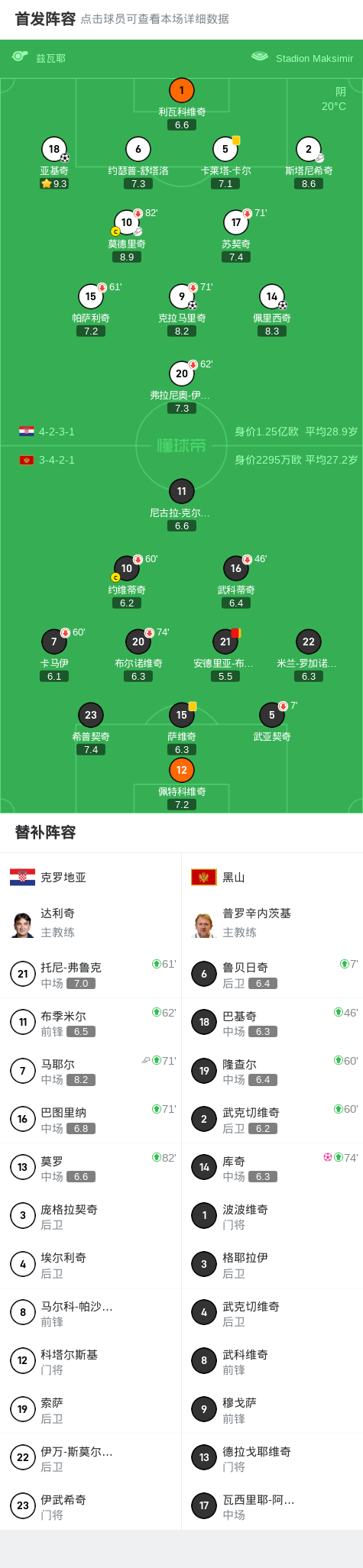第35分钟,打破僵局,亚基奇外围内切直接兜射破门,克罗地亚1-0