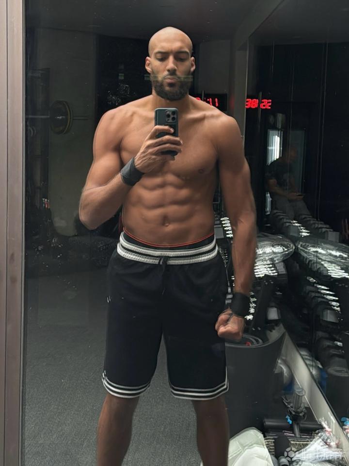 在这张照片中,戈贝尔手持手机对镜自拍,他将发型改为光头,同时露出了自己非常健美的上肢肌肉,他的胸肌和腹肌线条优美,绰号“法国吴彦祖”的戈贝尔也展示出了帅气的“硬汉”的形象。