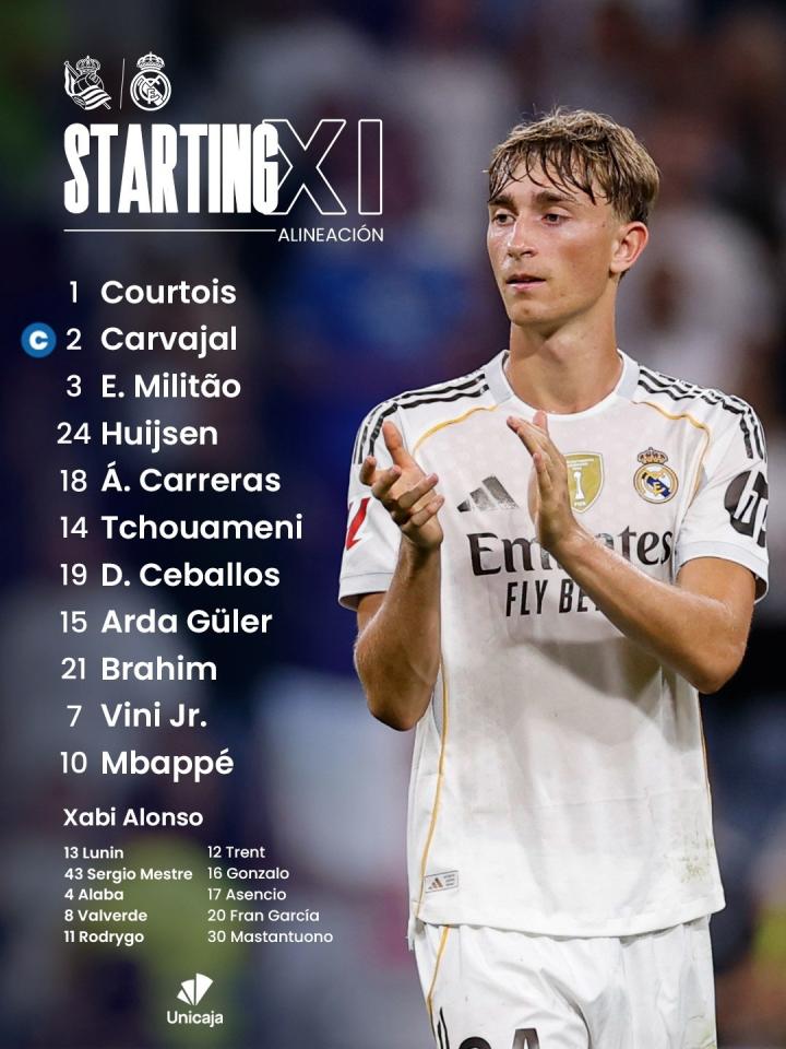 北京时间9月13日晚间22:15,西甲联赛第4轮,皇家马德里做客阿诺埃塔球场,挑战皇家社会,双方首发名单: