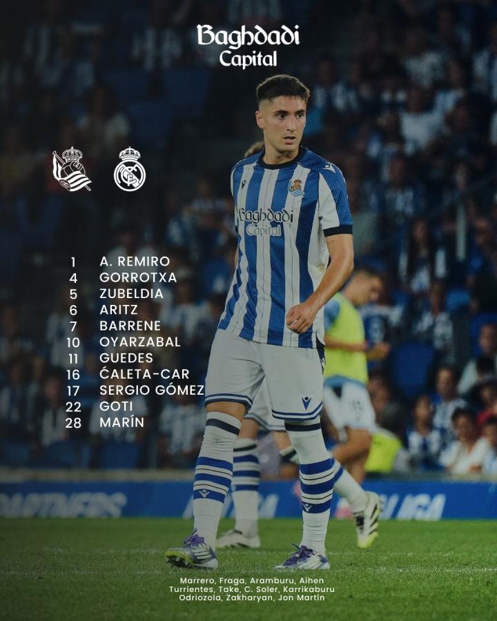 皇家社会首发:1-雷米罗、17-塞尔希奥-戈麦斯、6-埃卢斯通多、5-苏贝尔迪亚、16-卡莱塔-卡尔、4-戈罗恰特吉、22-戈蒂、7-巴雷内切亚、28-巴勃罗-马林、10-奥亚萨瓦尔、11-贡萨洛-格德斯