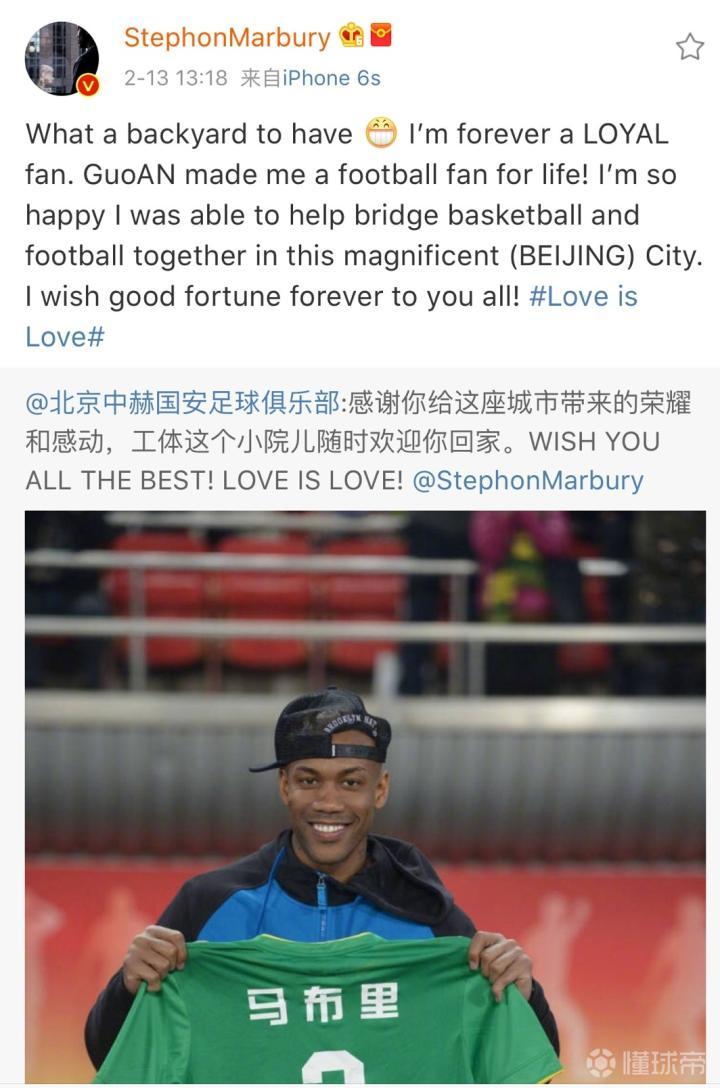 马布里在微博中写道:“我永远是一个忠实的粉丝。国安让我成为一个终身的足球迷!我很开心我能够成为篮球和足球在这座宏伟的城市(北京)的桥梁。祝愿你们未来好运!”
