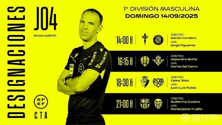 西班牙足协官方公布了周日西甲比赛裁判安排,吉列尔莫-夸德拉将执法巴萨vs瓦伦西亚。