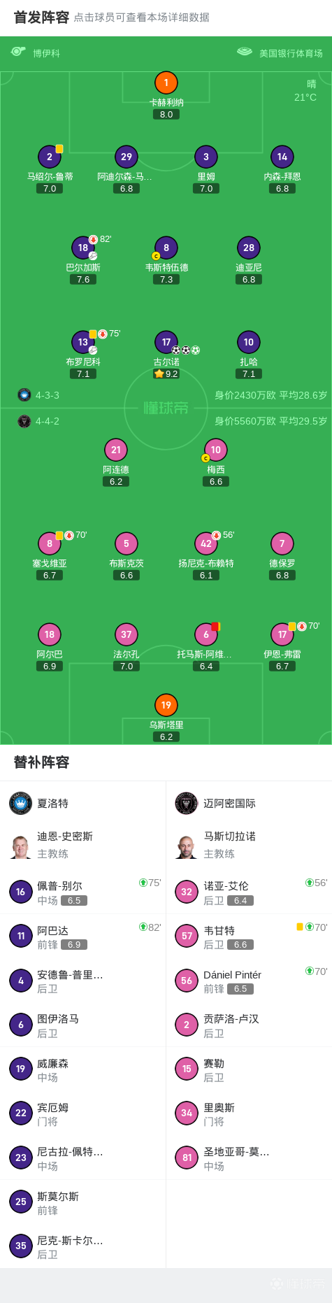 北京时间9月14日,美国职业大联盟常规赛,夏洛特主场对阵迈阿密国际。上半场,梅西造点后勺子点球被扑,紧接着古尔诺反击破门。下半场,古尔诺再下两城上演帽子戏法,阿维莱斯累计两黄被罚下,布斯克茨送点。最终,迈阿密国际客场0-3完败夏洛特。