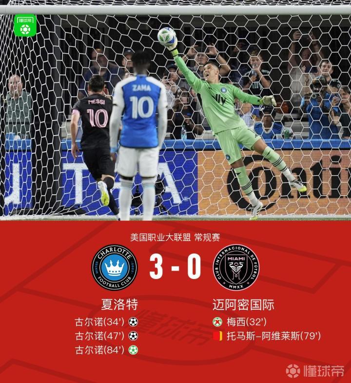十人迈阿密国际客场0-3夏洛特,梅西造点后勺子点球被扑,古尔诺戴帽