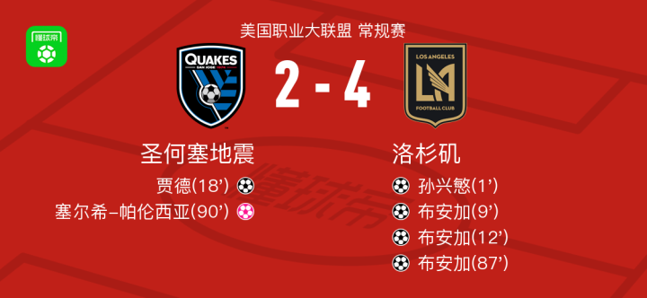 北京时间9月14日美国职业大联盟 常规赛,圣何塞地震主场对阵洛杉矶。圣何塞地震贾德破门。洛杉矶孙兴慜破门,布安加帽子戏法,塞尔希-帕伦西亚自摆乌龙。最终比分圣何塞地震 2-4 洛杉矶。