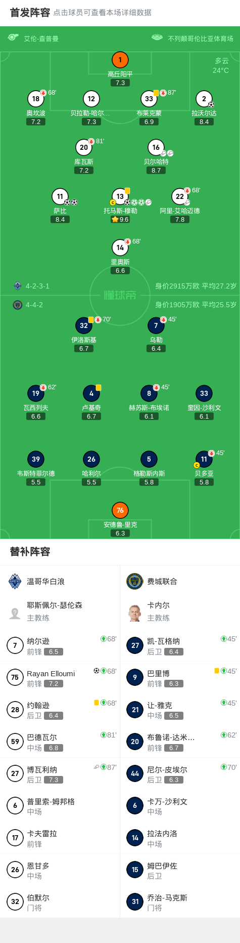 第80分钟,温哥华白浪球员贝尔哈特助攻Rayan Elloumi打入一球。