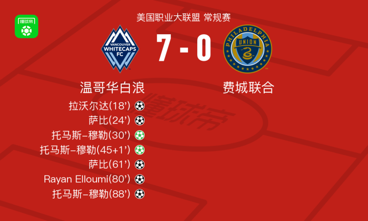 温哥华白浪7-0血洗费城联合,托马斯-穆勒帽子戏法,萨比双响