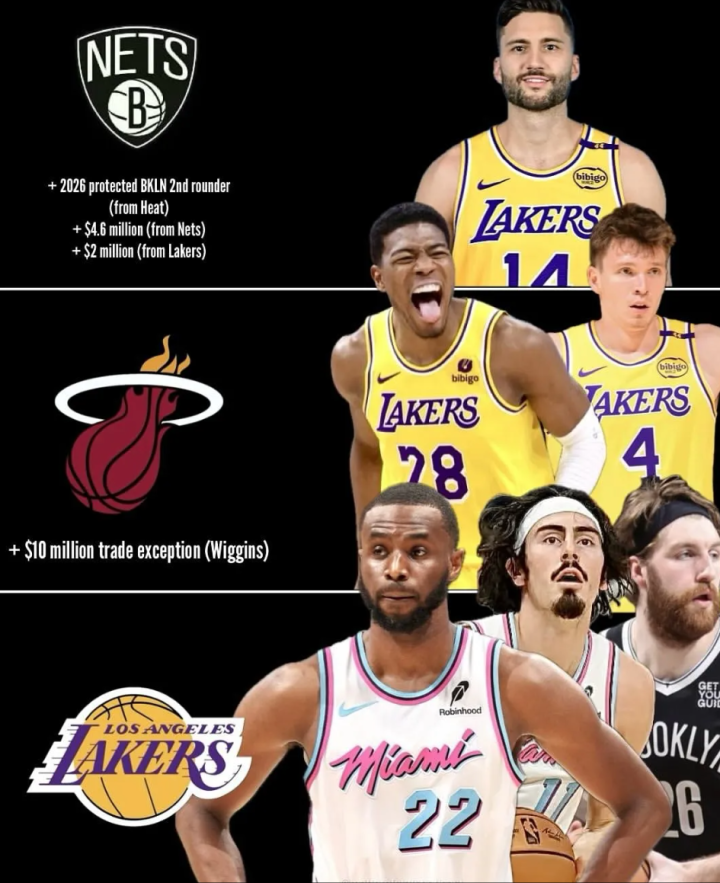 具体来说,就是湖人队得到维金斯、哈克斯和德鲁-迪米,热火队得到八村塁、克内克特和1000万美元交易特例,篮网队得到克莱伯、热火队2026年受保护次轮签以及660万美元。