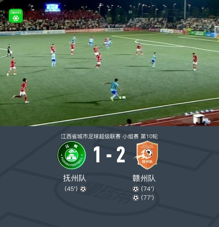 赣州队2-1逆转抚州队战报bot @懂球帝2025-09-14 21:38北京时间9月14日江西省城市足球超级联赛 小组赛 第10轮,抚州队对阵赣州队。最终比分抚州队 1-2 赣州队。点击查看本场比赛详细数据>>点击查看赣超完整积分榜>>精彩瞬间第45分钟,抚州队球员打入一球。第74分钟,赣州队球员打入一球。第77分钟,赣州队球员打入一球。展开更多