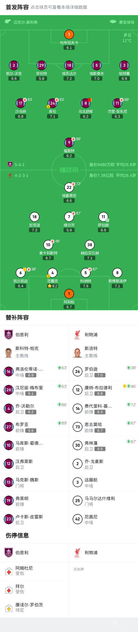 第38分钟,利物浦换人,罗伯逊替补上阵,凯尔凯兹被换下