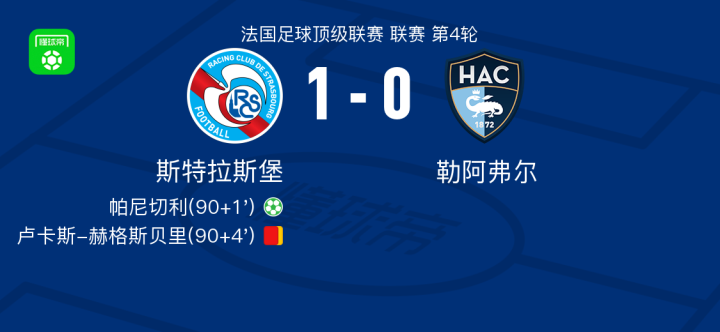斯特拉斯堡1-0勒阿弗尔,帕尼切利点射制胜战报bot2025-09-15 01:15北京时间9月14日法国足球顶级联赛 联赛 第4轮,斯特拉斯堡主场对阵勒阿弗尔。斯特拉斯堡帕尼切利破门。最终比分斯特拉斯堡 1-0 勒阿弗尔。点击查看本场比赛详细数据>>点击查看法甲完整积分榜>>精彩瞬间下半场补时第1分钟,斯特拉斯堡球员帕尼切利罚入点球。下半场补时第4分钟,斯特拉斯堡球队卢卡斯-赫格斯贝里吃到第二张黄牌。 球队阵容 技术统计 展开更多