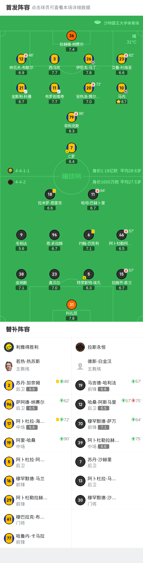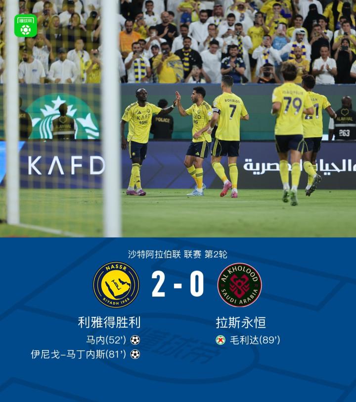 利雅得胜利2-0拉斯永恒,马内破门,伊尼戈-马丁内斯建功