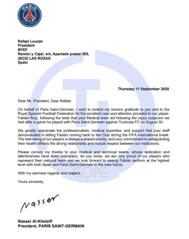 我谨代表巴黎圣日耳曼俱乐部,向您以及西班牙皇家足球协会致以诚挚的感谢。感谢贵方在我队球员法比安-鲁伊斯于8月30日代表巴黎圣日耳曼对阵图卢兹比赛后出现伤情疑虑时,贵方医疗团队所提供的细致检查与周到照护。