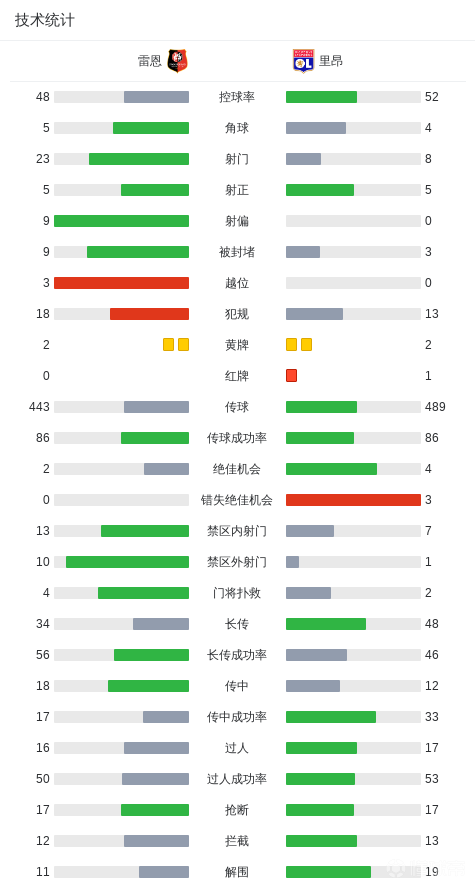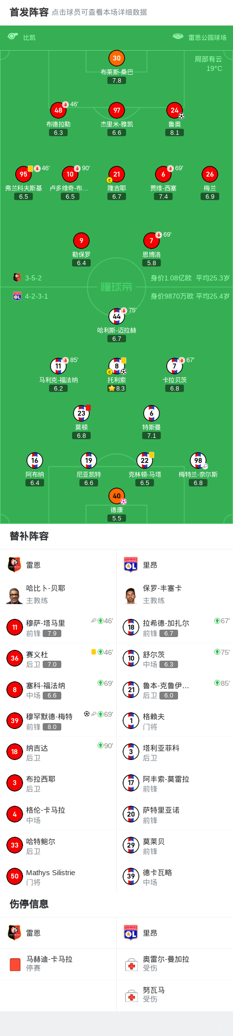 雷恩3-1逆转十人里昂,鲁奥建功,梅特传射+造乌龙+造红牌
