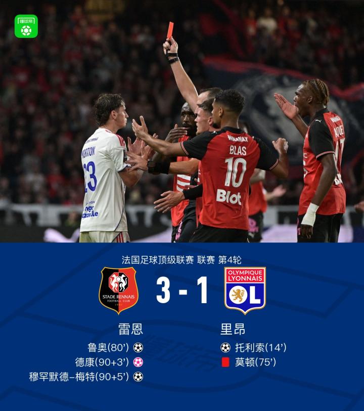 北京时间9月15日法国足球顶级联赛第4轮,雷恩主场迎战里昂。上半场,奈尔斯助攻托利索头球破门,迈拉赫单刀打门被扑;下半场,莫顿勾倒梅特被直红罚下,鲁奥乱中抢射破门扳平比分,梅特极小角度打门造成德康自摆乌龙上演逆转,塔马里助攻梅特头球攻门得手。最终将比分定格为3比1。全场比赛结束,雷恩主场取胜。