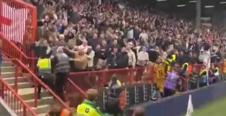 视频中显示,一名球迷在米尔沃尔球迷庆祝时从远端飞速跑来,并且想跃上看台一同庆祝。