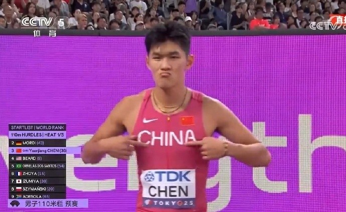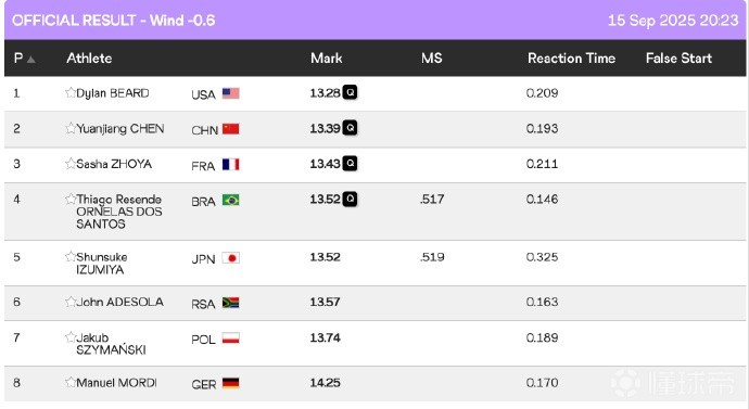 北京时间9月15日,东京田径世锦赛男子110米栏预赛:陈圆将成绩为13秒39、排名小组第二,顺利晋级半决赛。美国选手拜尔德13秒28小组第一,男子110米栏的半决赛将在明晚进行。