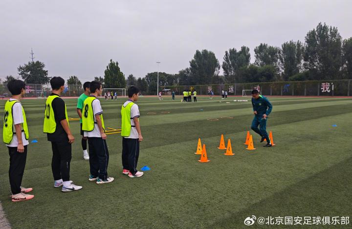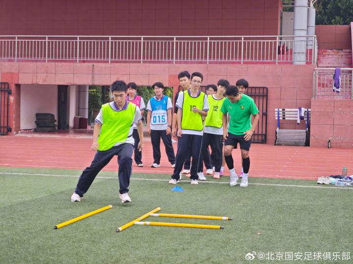 北京国安针对建大附中学生们的足球基础,定制了专属的足球一堂课,由国安青训教练带领下,进行了职业足球训练体系的运动表现和足球基础带球训练项目。