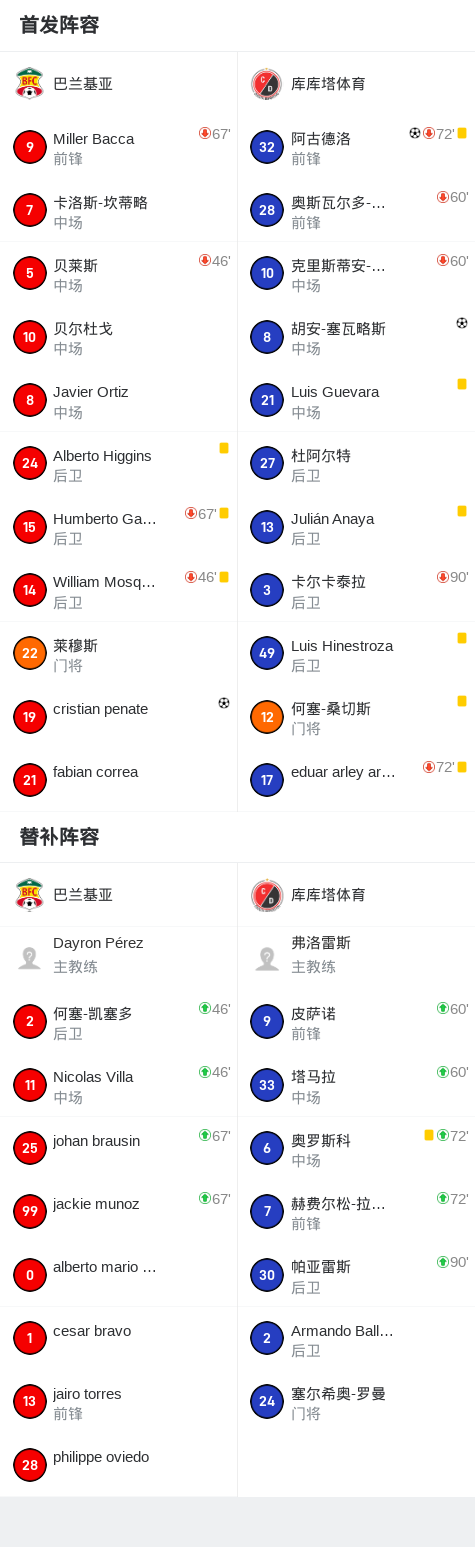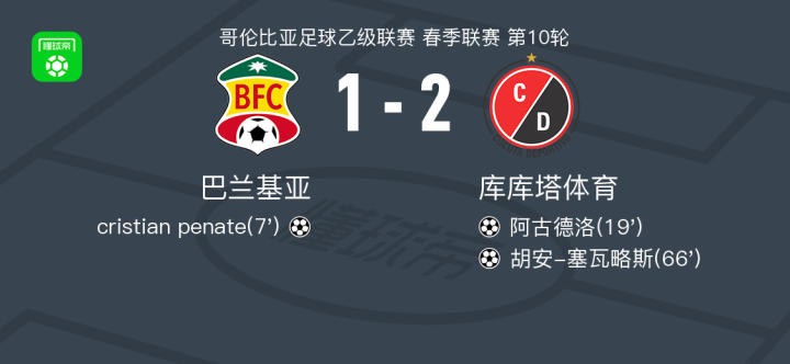 北京时间9月16日,哥伦比亚足球乙级联赛春季联赛第10轮,巴兰基亚坐镇主场迎战库库塔体育。比赛中,巴兰基亚由球员cristian penate率先打破僵局。随后,库库塔体育由阿古德洛扳平比分。进入下半场,库库塔体育球员胡安-塞瓦略斯攻入制胜一球。最终,全场比赛结束,巴兰基亚以1比2不敌库库塔体育。