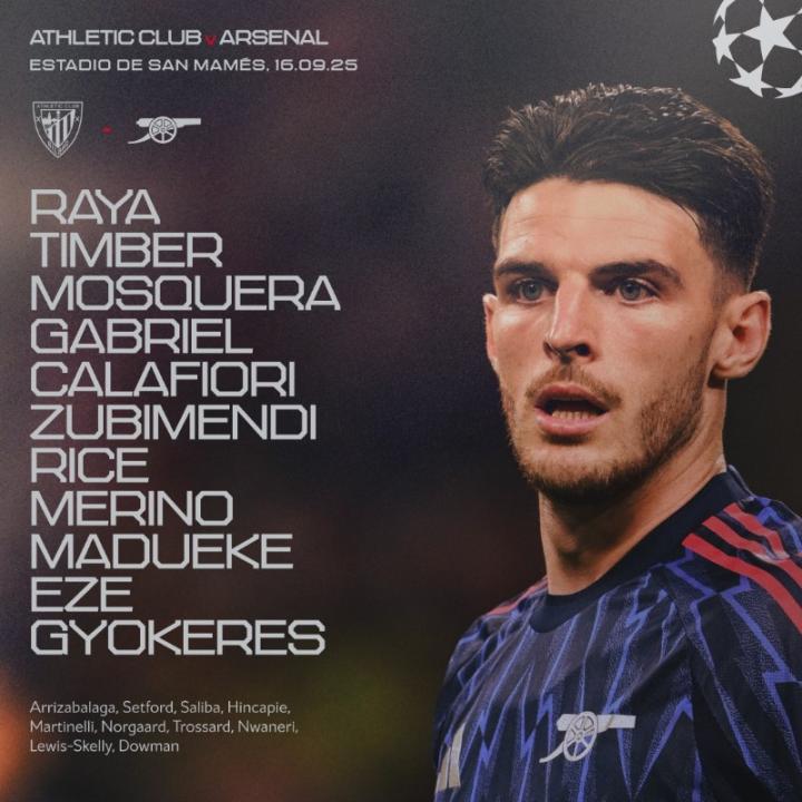 阿森纳客战毕尔巴鄂竞技:哲凯赖什、埃泽首发,萨利巴替补