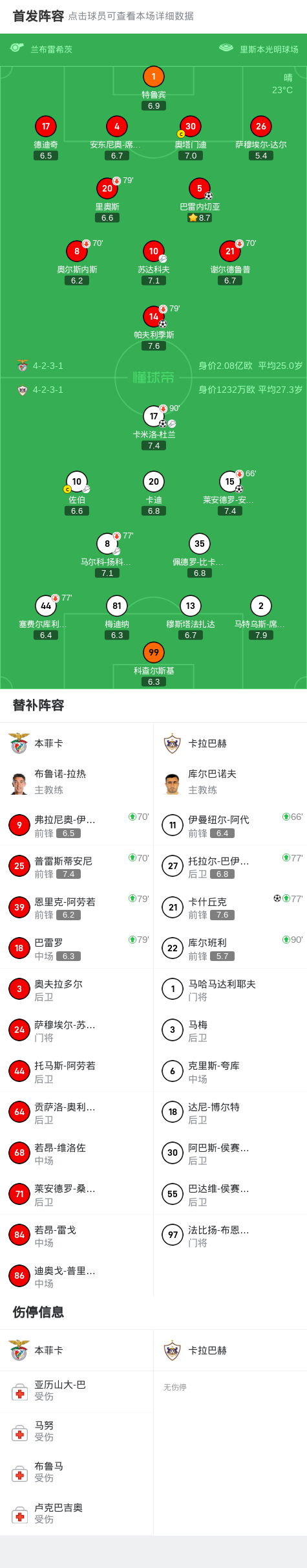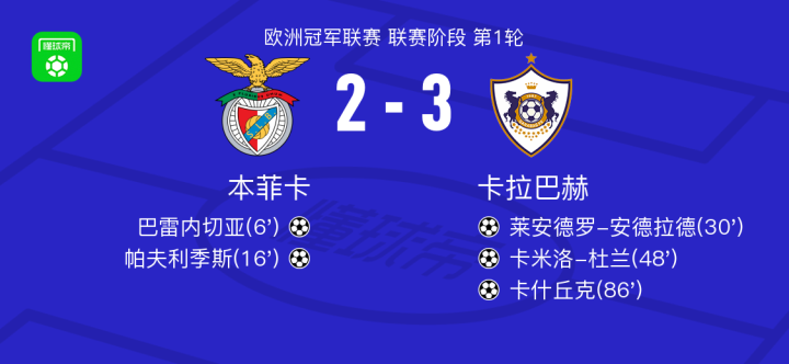 北京时间9月17日欧洲冠军联赛 联赛阶段 第1轮,本菲卡对阵卡拉巴赫。本菲卡巴雷内切亚破门,帕夫利季斯破门。卡拉巴赫莱安德罗-安德拉德破门,卡米洛-杜兰破门,卡什丘克破门。最终比分本菲卡 2-3 卡拉巴赫。