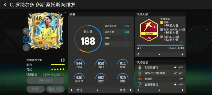 如果要评选一名本次冠军杯赛事的最佳球员,那C罗绝对当之无愧。作为游戏中最顶尖的前锋,148能力值的25赛季最佳终极C罗强度十足。他的天赋配备了强力锋霸,基础花式高级油炸丸子赋予了他一流的前场摆脱能力。