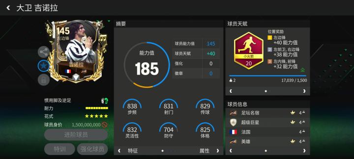 吉诺拉在本次冠军杯赛事中受到了众多选手的喜爱。游戏中,赛场乐章四重奏活动中推出了一张145能力值的吉诺拉,他的天赋配备了小火箭,基础花式为高级油炸丸子,边路持球进攻能力相当出色。