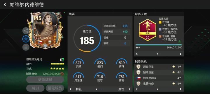 捷克铁人内德维德本次冠军杯活动表现不俗,多次在边路制造威胁。游戏中,赛场乐章四重奏活动中推出了一张145能力值的内德维德,他的天赋配备了边锋热门的猎鹰,基础花式为马赛回旋,具备一定的边路突破能力。