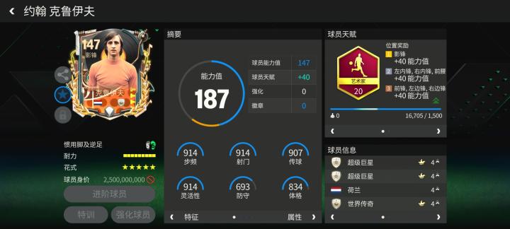 能传能射的克鲁伊夫在本次冠军杯赛事中是很多选手钦点的中前场进攻核心。游戏中,赛场乐章四重奏活动中推出了的147克鲁伊夫,他的天赋配备了艺术家,基础花式为高级油炸丸子,具备顶尖的盘带突破能力。