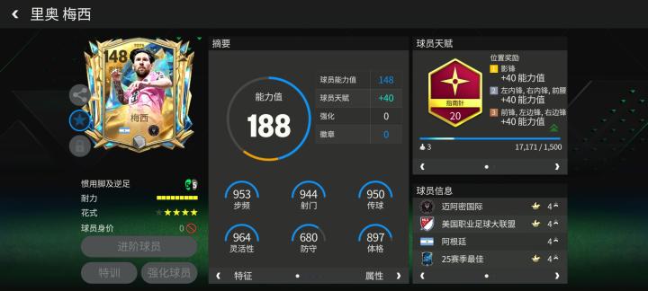 梅西在本次冠军杯赛事中的出镜率相当高,屡屡打进关键球。游戏中,148能力值赛季最佳终极梅西配备了指南针天赋,对他的盘带以及速度表现都有提升,高级油炸丸子花式也让手感本就灵活的他突破更加犀利。