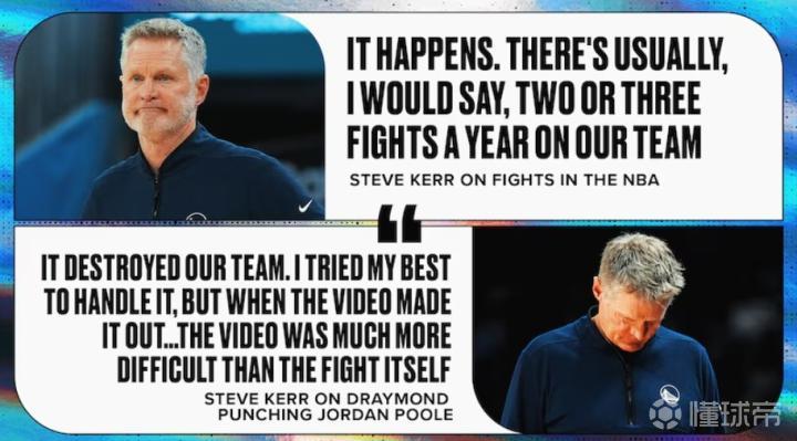 近日,勇士队主帅史蒂夫-科尔在一次研讨会中表示,在篮球界,每支球队每年都会发生两到三起队内斗殴。