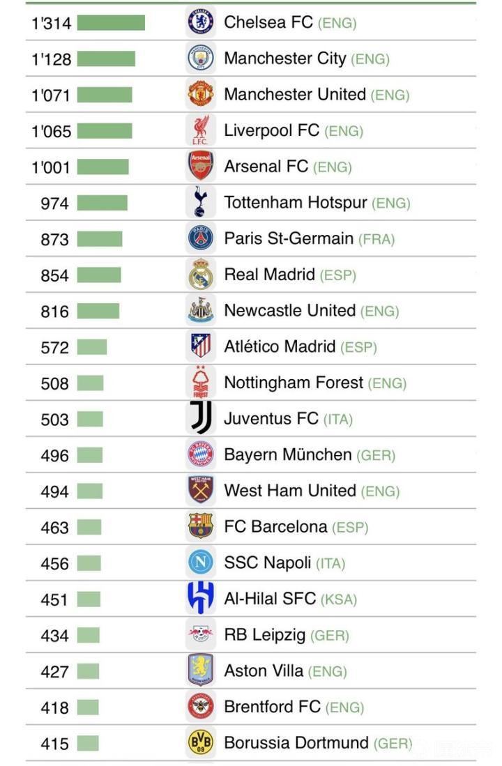CIES公布组建当前阵容花费榜单:切尔西居首,前六均来自英超