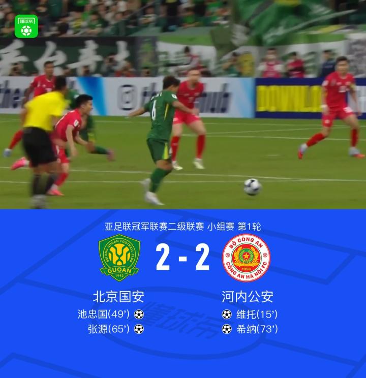 国安2-2河内公安,张源传射,池忠国建功,河内门将两度送礼