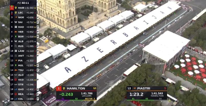 北京时间9月19日,F1阿塞拜疆大奖赛第二次练习赛结束。汉密尔顿全场最快,勒克莱尔、拉塞尔位居二三。安东内利第4,贝尔曼第5,维斯塔潘第6,劳森第7,奥康第8,阿尔本第9,诺里斯第10,皮亚斯特里第12,角田裕毅第14。