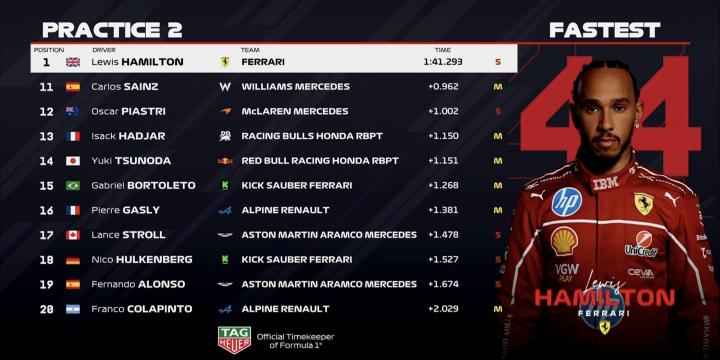 二练剩余13分钟,汉密尔顿旧软胎再飞一圈,借到勒克莱尔的尾流成功来到榜首,这个成绩已经超过了队友在去年的杆位成绩!