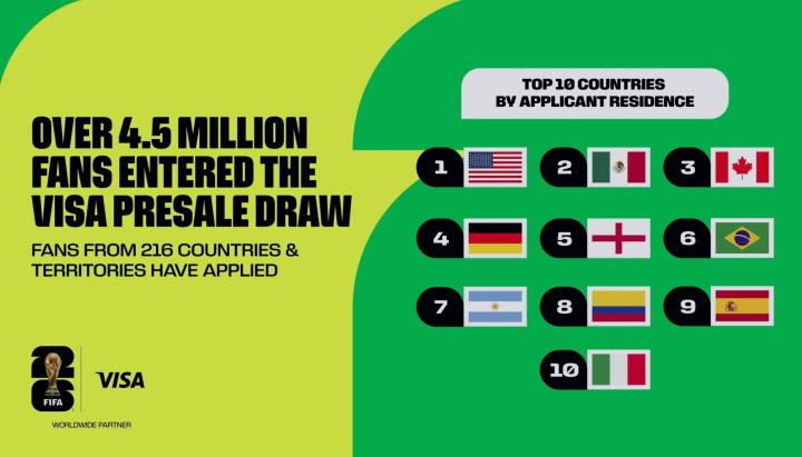 国际足联(FIFA)宣布,在为期十天的2026年世界杯首轮门票预售抽签阶段,来自216个国家和地区的超过450万名球迷递交了申请,争取首批购票机会。这届赛事将于明年6月至7月在加拿大、美国和墨西哥三国举行,成为历史上规模最大的一届世界杯。