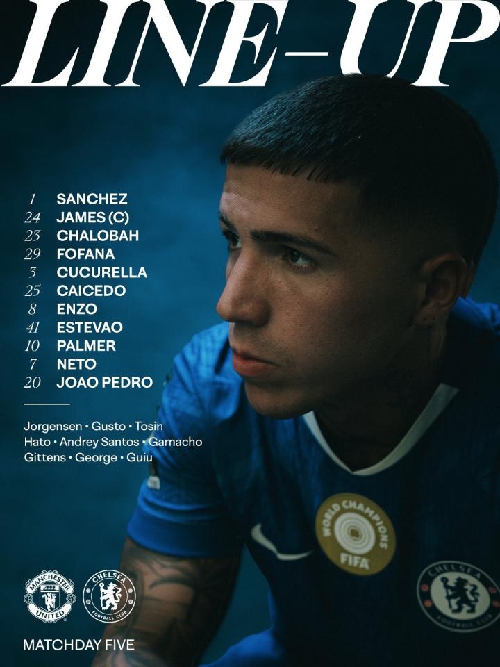 切尔西首发:1-罗伯特-桑切斯、24-里斯-詹姆斯、23-特雷沃-查洛巴、29-韦斯利-福法纳、3-库库雷利亚、25-莫伊塞斯-凯塞多、8-恩佐-费尔南德斯、41-埃斯特旺、10-帕尔默、7-佩德罗-内托、20-若昂-佩德罗