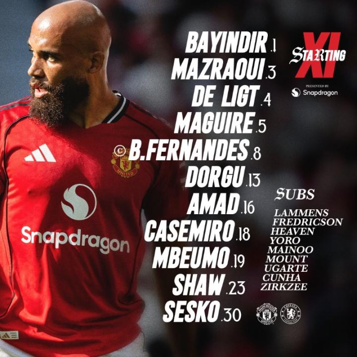 曼联首发:1-巴因迪尔、3-马兹拉维、4-德利赫特、5-马奎尔、23-卢克-肖、13-多古、18-卡塞米罗、8-布鲁诺-费尔南德斯、16-阿马德-迪亚洛、19-姆伯莫、30-谢什科