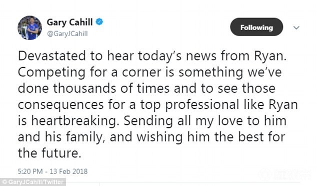 “听到瑞安退役的消息让我十分的震惊,那是我们重复过千百次的争顶,看到那样的意外发生在瑞安这样的顶级职业球员身上让人心碎。我要把我的爱传递给瑞安还有他的家人,我也祝福他在未来的道路上一切顺利。”加里-卡希尔在自己的推特主页里写道。