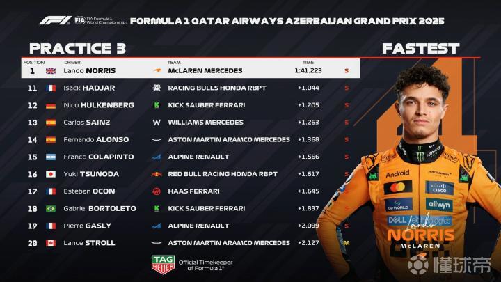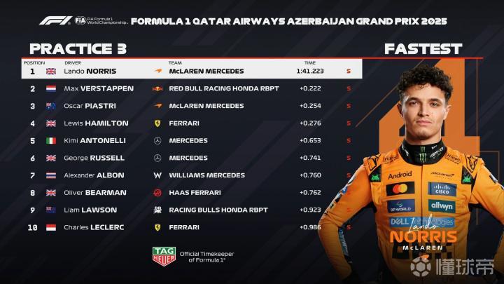 F1阿塞拜疆三练:诺里斯全场最快,汉密尔顿P4,勒克莱尔P10