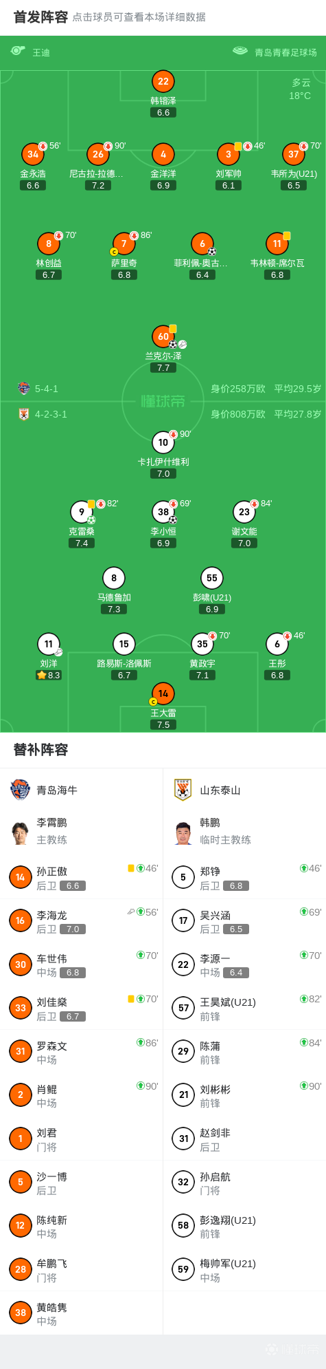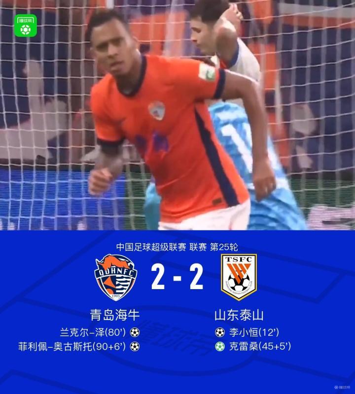 北京时间9月20日20:00,中超第25轮迎来齐鲁德比,山东泰山作客青岛青春足球场挑战青岛海牛,本场主裁判为王迪,VAR裁判为沈寅豪。上半场,刘洋助攻李小恒鱼跃头槌首开记录;随后刘军帅手球送点,克雷桑点射破门。下半场,兰克尔-泽为海牛扳回一城后又助攻奥古斯托补时绝平。最终,山东客场2-2战平海牛。