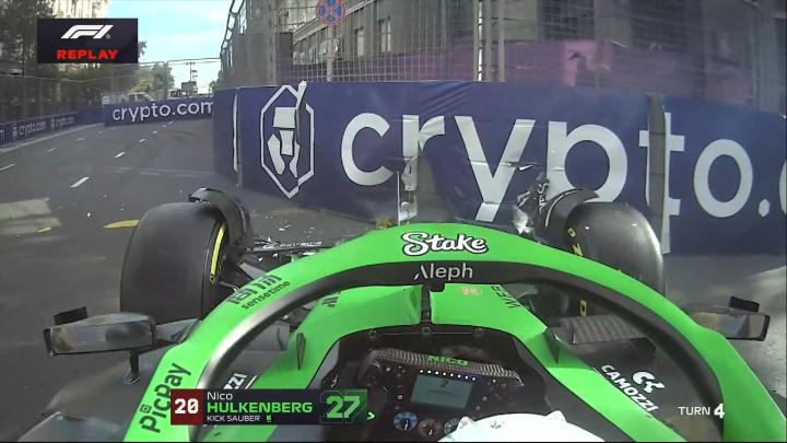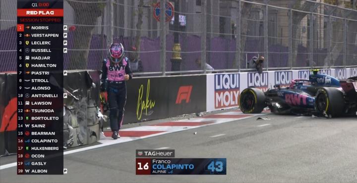 两台Alpine!镜头一转科拉平托在4号弯上墙,赛车悬挂断裂&前翼受损,这才是引发红旗的真正原因,而他去年驾驶威廉姆斯赛车时也在此上墙!