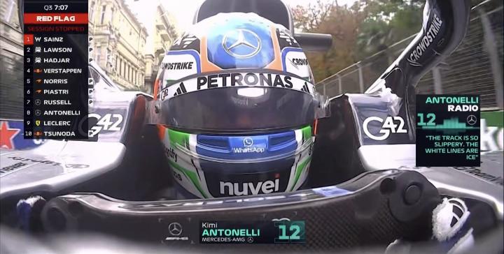 多位车手向车队报告现场出现降雨的状况,安东内利表示赛道上的白线像在冰上开一样;