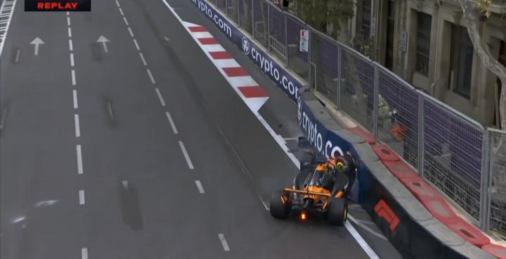 红旗×6!皮亚斯特里在3号弯错过刹车点上墙,赛车前悬挂严重受损!