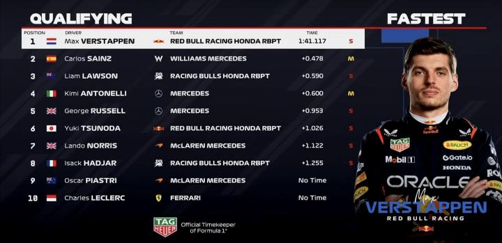 第1-第5:维斯塔潘、塞恩斯、劳森、安东内利、拉塞尔