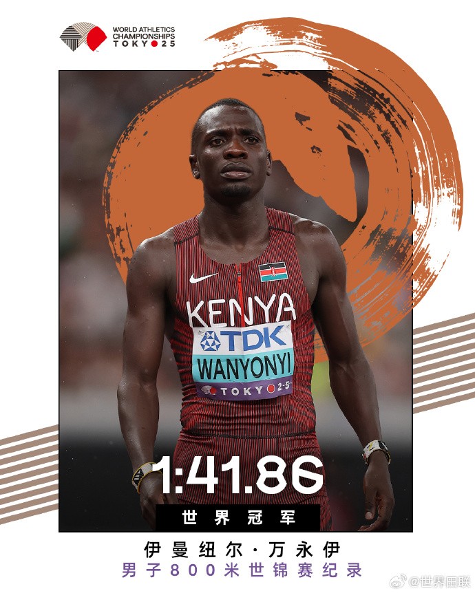 9月20日,2025年东京田径世锦赛男子800米决赛果然上演极致对决,前三名的争夺一直持续到最后冲线,最终巴黎奥运冠军万永伊守住优势,1分41秒86创造赛会纪录夺冠。