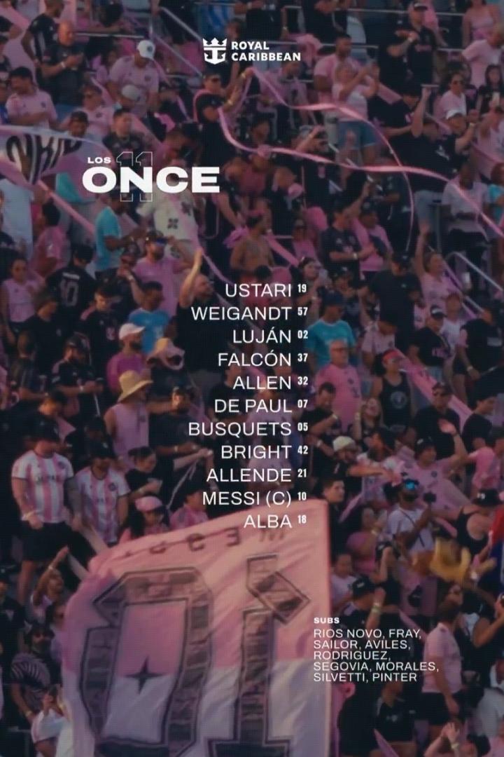 迈阿密国际首发:2-贡萨洛-卢汉、5-布斯克茨、7-德保罗、10-梅西、18-阿尔巴、19-乌斯塔里、21-阿连德、32-诺亚-艾伦、37-法尔孔、42-扬尼克-布赖特、57-韦甘特